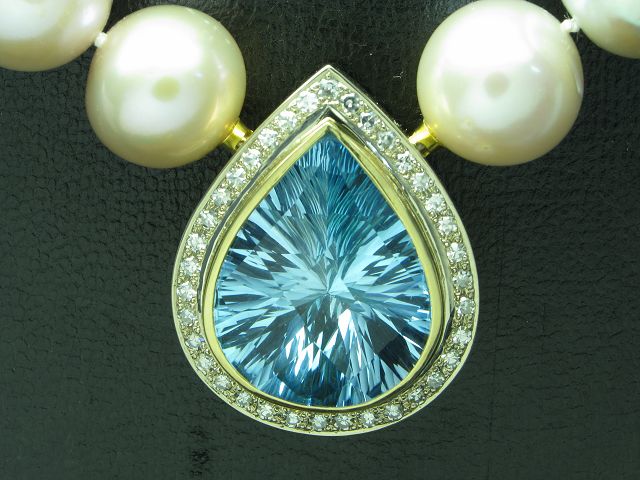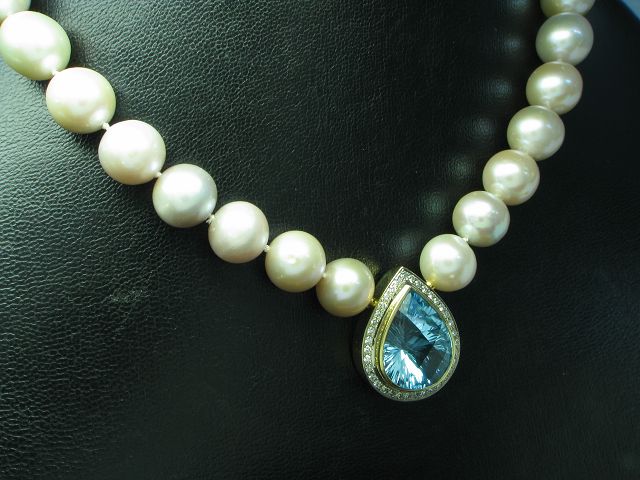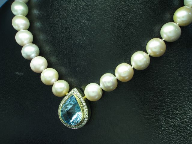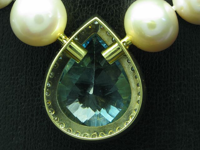 SÜßWASSERPERLEN COLLIER 18kt 750 GOLD MIT 4,50ct BLAUTOPAS UND DIAMANT BESATZ