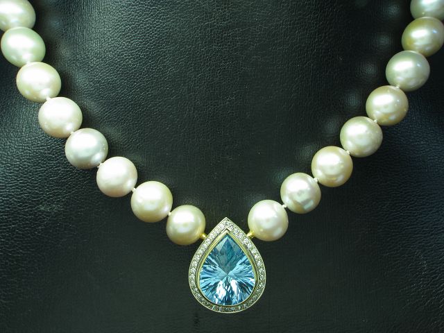 SÜßWASSERPERLEN COLLIER 18kt 750 GOLD MIT 4,50ct BLAUTOPAS UND DIAMANT BESATZ
