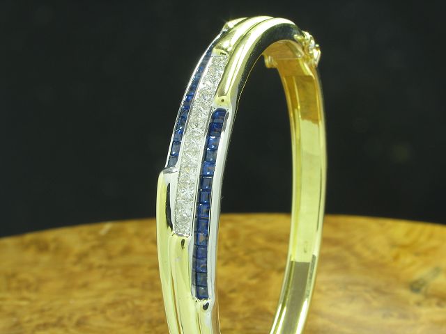 18kt GOLD ARMREIF MIT 1,56ct. DIAMANTEN IM PRINCESS SCHLIFF UND 1,16ct. SAPHIREN